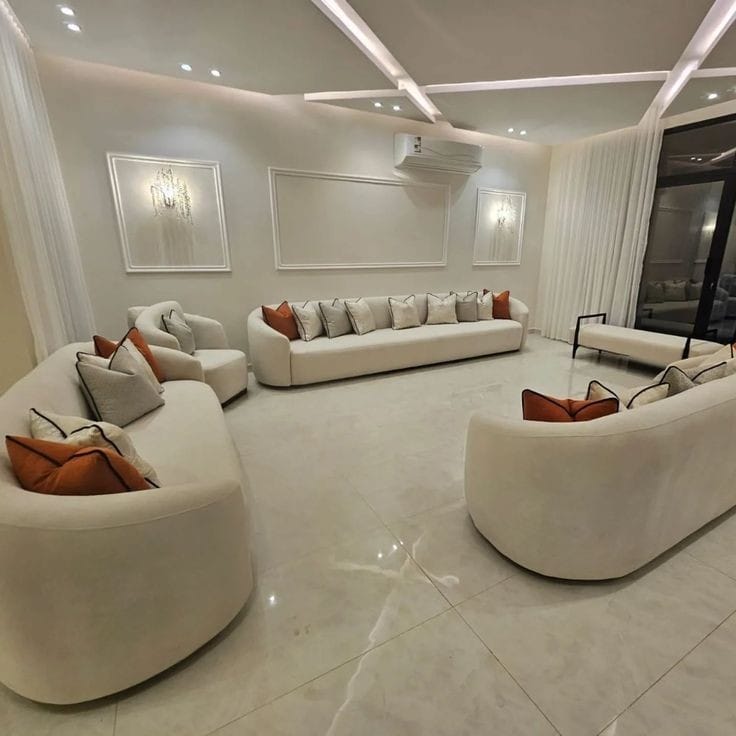 الأقمشة: مخمل، كتان، قطن، جلد صناعي أو طبيعي، مع ألوان ونقشات تناسب الديكور.